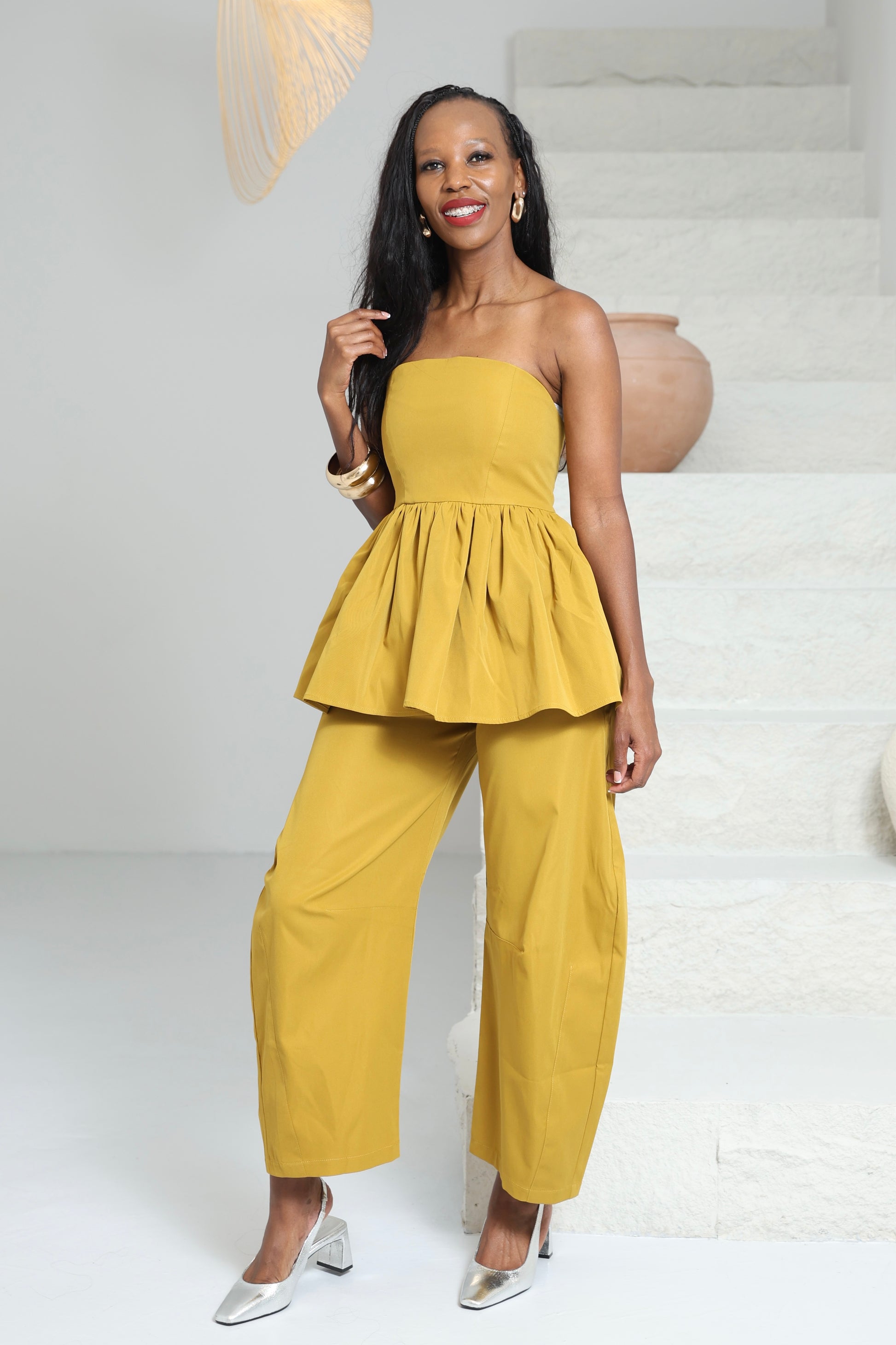 - Two-piece set: strapless peplum top & barrel-leg trousers