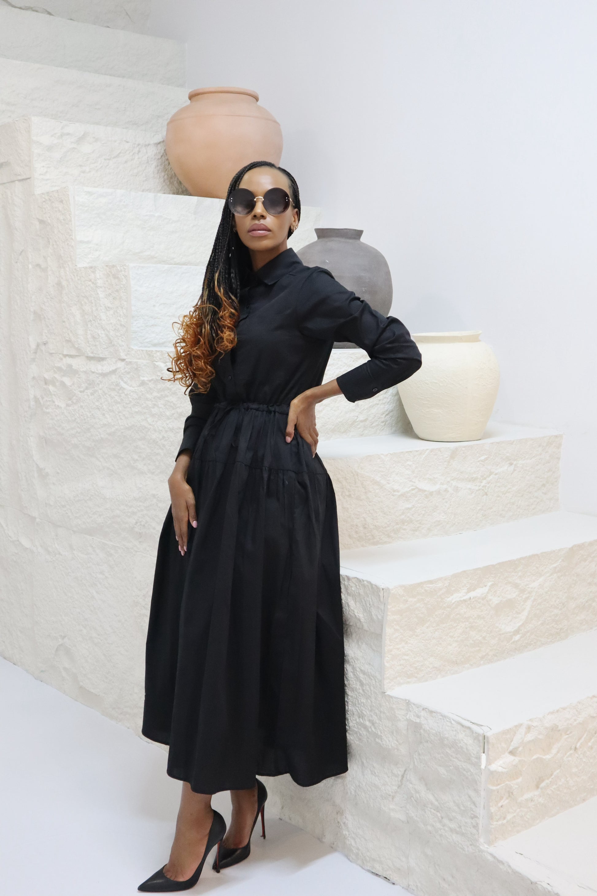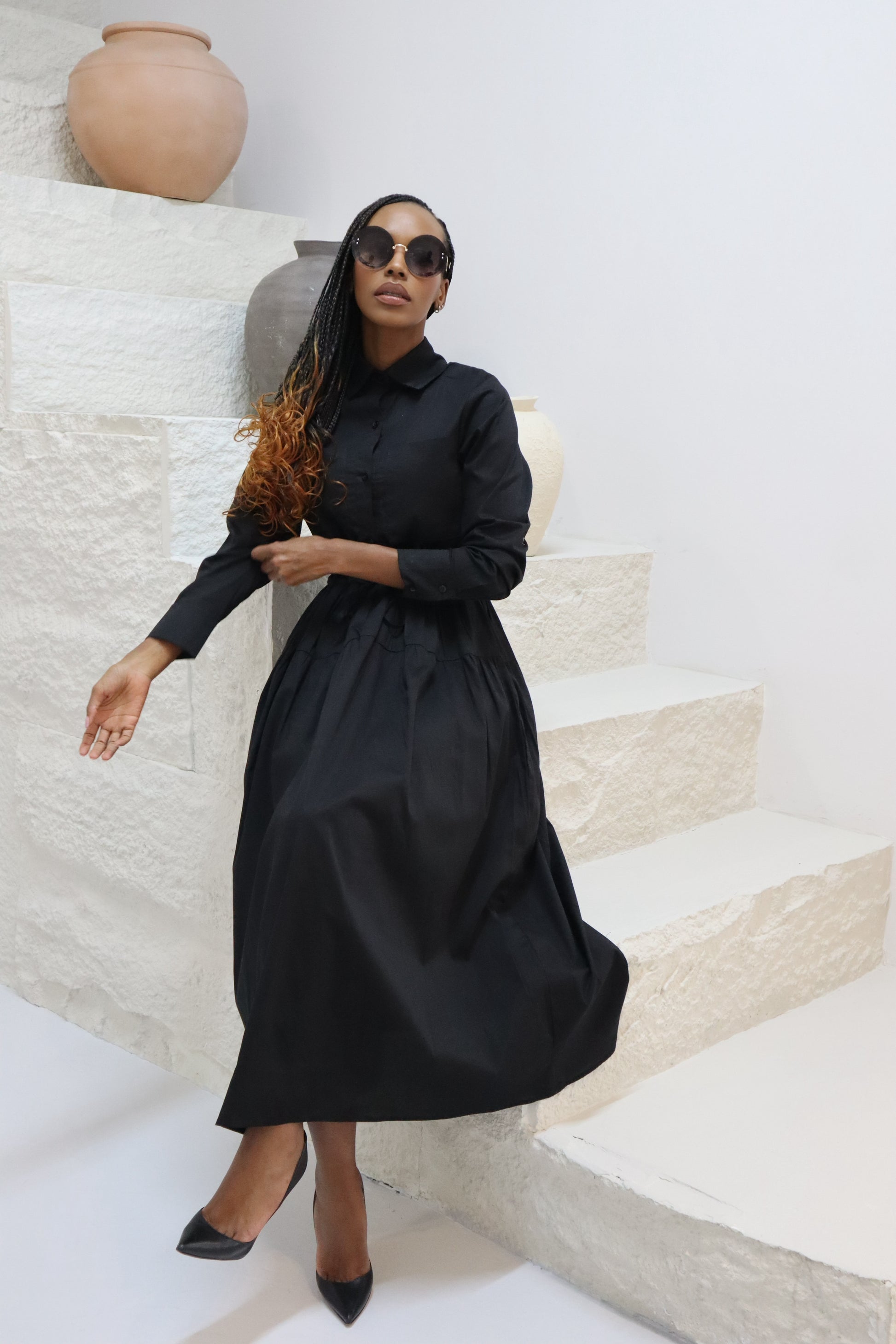 Where elegance meets ease, The Nia Shirt Dress redefines the power of simplicity. Tailored from crisp cotton with a soft sheen, this classic black dress offers a structured yet fluid silhouette that moves with confidence and grace.