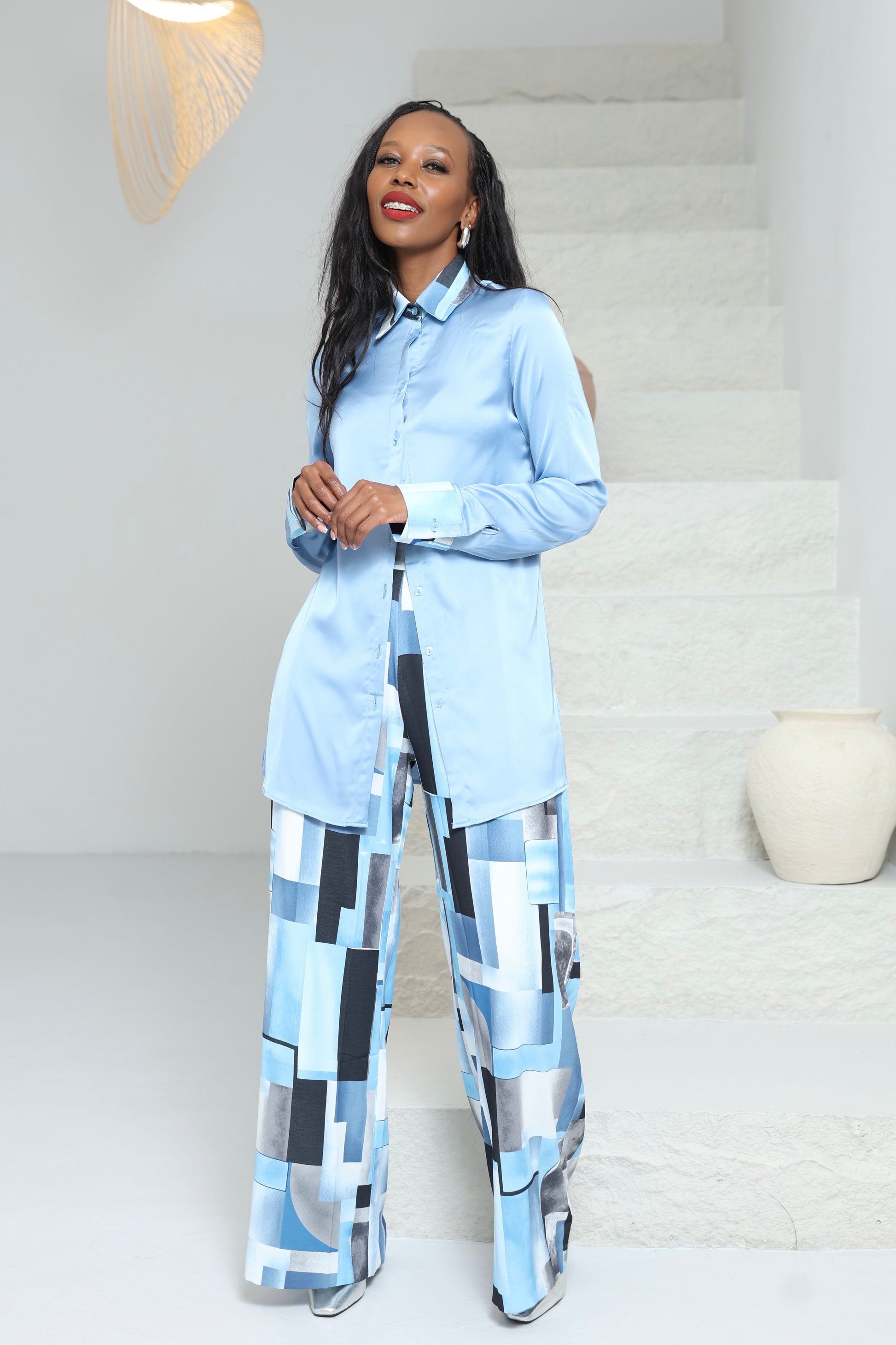 - Two-piece set: longline button-down shirt & wide-leg trousers