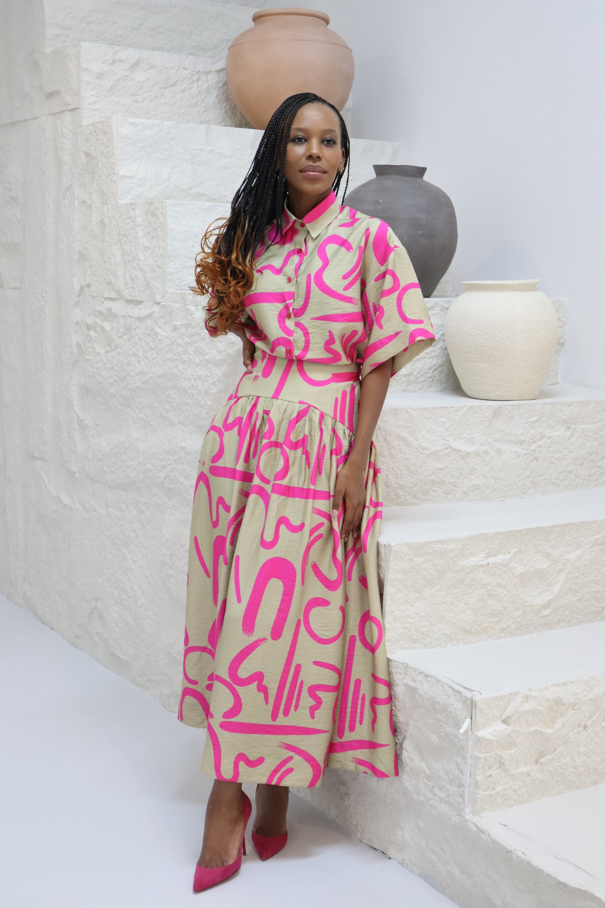 Vibrant. Sophisticated. Unapologetically bold. The Sanaa Set brings a contemporary twist to classic femininity with its abstract print and striking colour palette. The fuchsia brushstroke pattern dances across a soft neutral base, creating a look that’s both playful and polished.